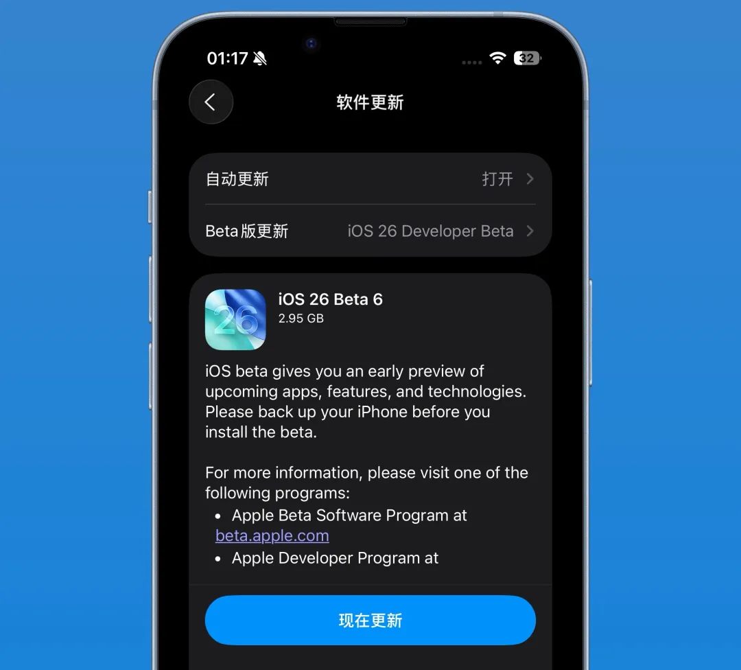 iOS 26 Beta 6 版本号为 23A5318c,从 Beta 5 进行 OTA 升级大约需要 2.95GB(测试机型 iPhone 16e,不同机型固件大小不同)