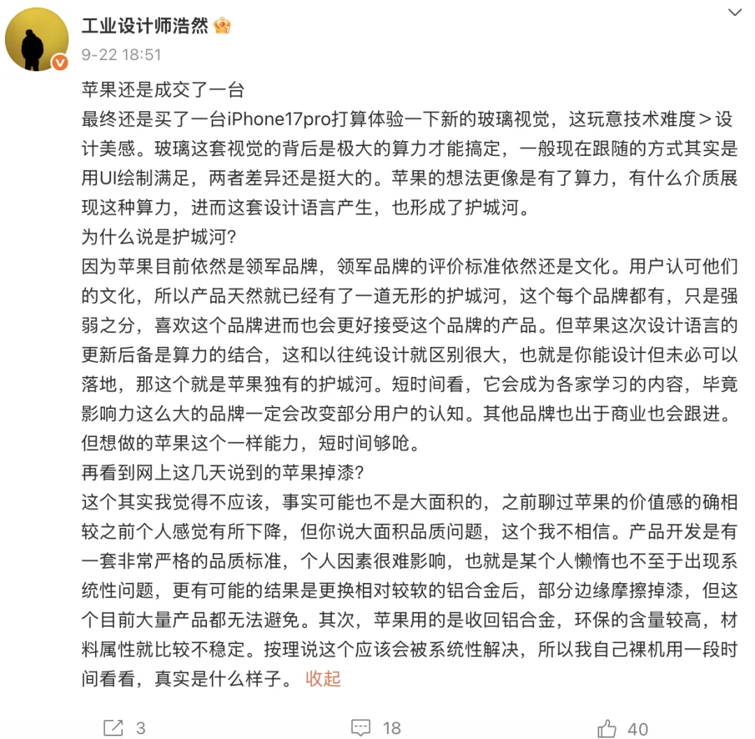 刘浩然表示,玻璃视觉的技术难度>设计美感,玻璃这套视觉的背后是极大的算力才能搞定,一般现在跟随的方式其实是用UI绘制满足,两者差异还是挺大的。苹果也是通过这样的一种方式形成自己的护城河,并且觉供应链消息,目前已经有友商也在跟进开发类似的视觉效果。