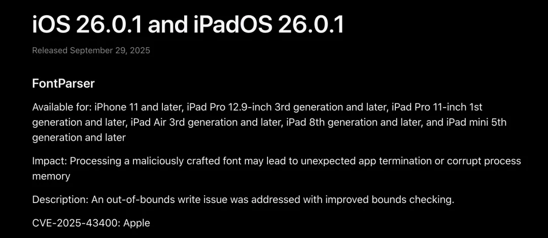 该更新覆盖 iPhone XS 至 iPhone 16 全系列设备,安全修复是此次更新的核心。官方明确指出,版本重点修复了 FontParser 组件的 "越界写入" 漏洞:攻击者可通过恶意制作的字体文件导致应用崩溃或进程内存损坏,苹果通过强化边界检查彻底封堵了这一风险。值得注意的是,按照苹果更新惯例,此次推送可能还包含未公开的隐性优化,进一步提升系统稳定性。