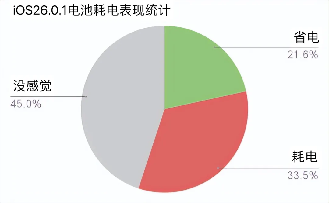 升级 iOS 26.0.1 后,用户对电池续航的反馈分歧明显:33.5% 用户认为更耗电,仅21.6%的用户反馈更加省电,有45%的用户觉没有感觉。