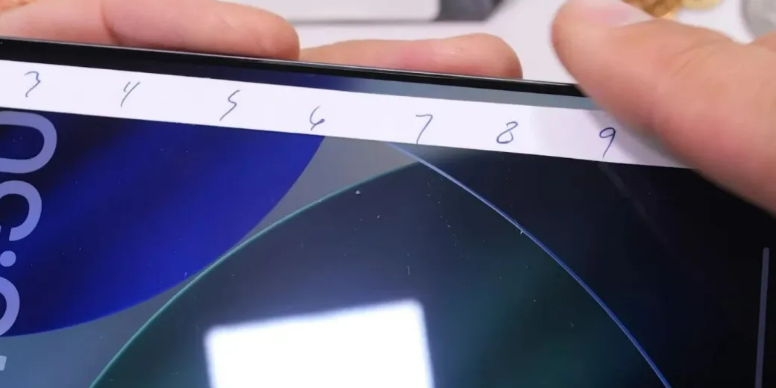 Jerry依惯例先去测屏幕硬度。拿出不同级别的莫氏硬度测试工具,从低往高开始划动。到6级时屏幕完全没动静,7级起能看见很淡的痕迹,竟然8级才出现比较明显的划伤。