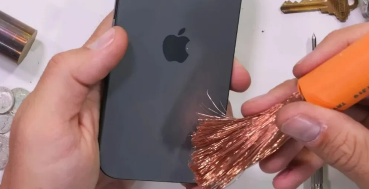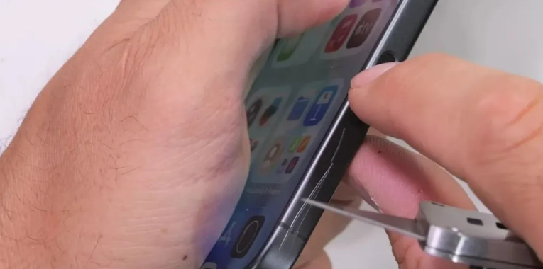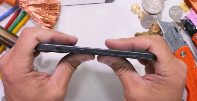 接下来检测中框,这还真是iPhone17的薄弱之处。Jerry轻轻地用刀尖一划,铝合金表面马上就显现出里面的金属原本的颜色。说真的这点确实让有强迫症的用户挺不爽的。