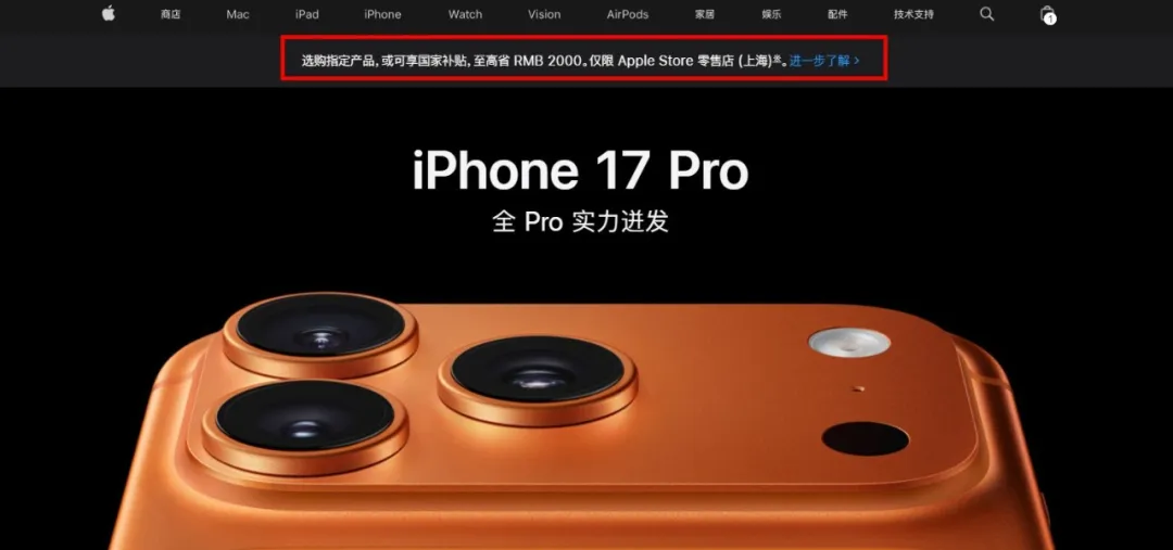值得关注的是,iPhone 17 标准版首次进入上海 Apple Store 直营店国补范围。