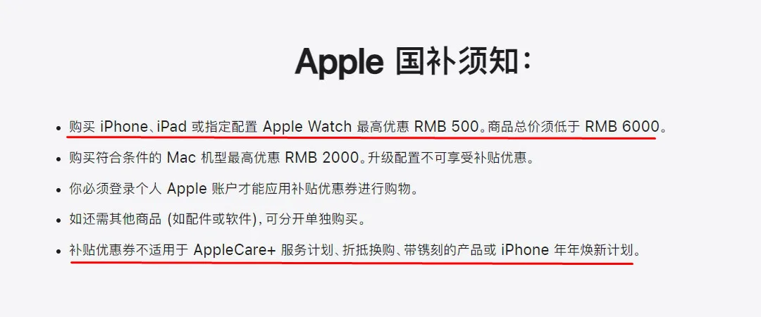 从补贴规则来看,售价≤6000 元的 iPhone、iPad、Apple Watch,可享 15% 国家补贴,单件最高减 500 元;Mac 部分机型无价格限制,享 20% 补贴,单件最高减 2000 元,优惠力度相对最大。