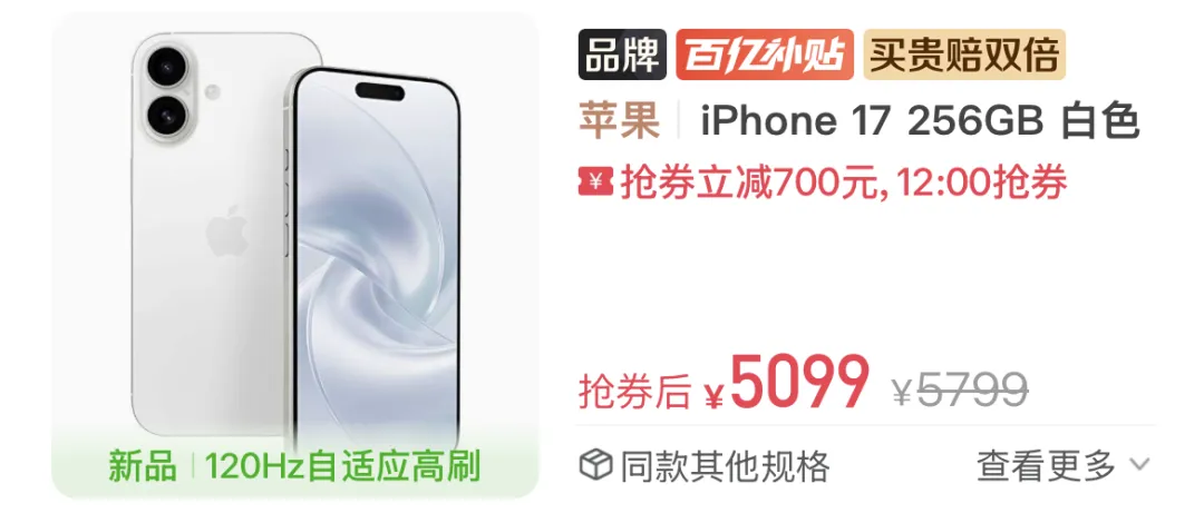 比如 iPhone 17 标准版领券后 5099 元起,比国补价还低 400 元;iPhone 17 Pro 系列官方原价 8999 元起,百亿补贴后 8099 元起。