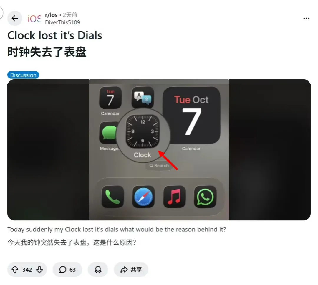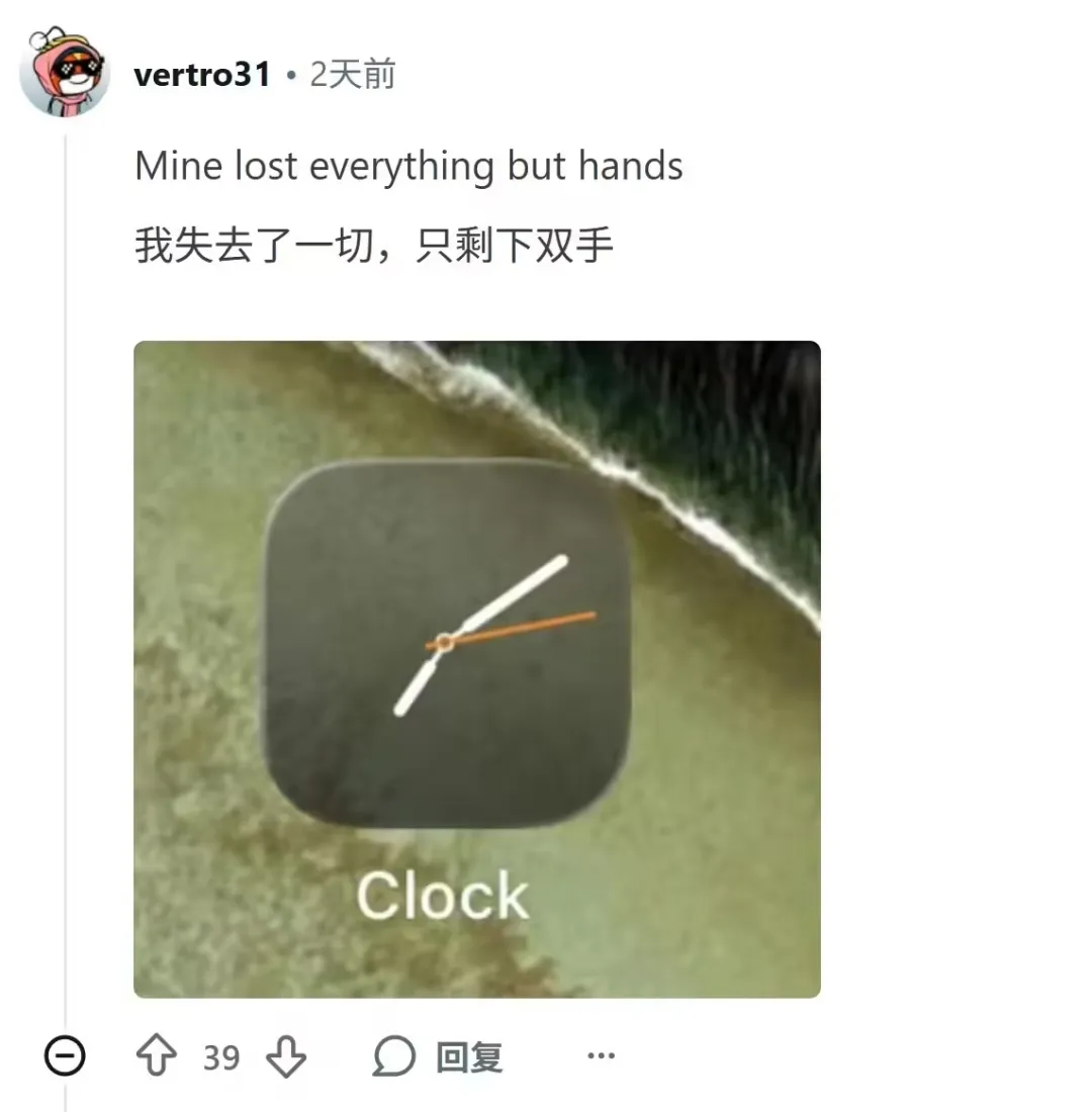 甚至有用户碰到了更奇怪的时钟视觉异常,指针仍在转动,但时间刻度完全消失,十分离谱。