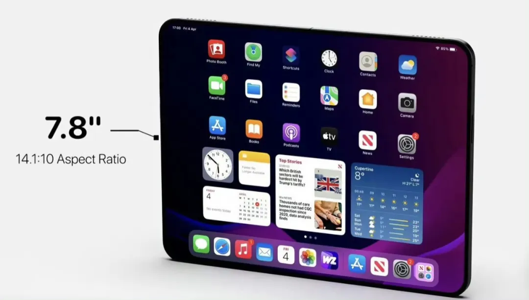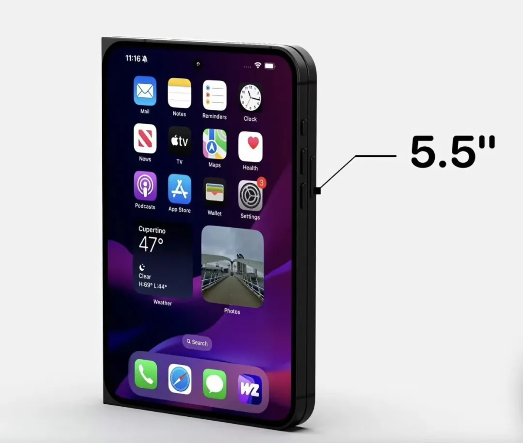 iPhone Ultra 展开后是 7.8 英寸的内屏,外屏是 5.5 英寸。整体形态就是两个 iPhone Air 的堆叠。