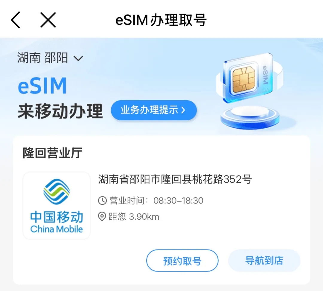 可以发现,想办理 eSIM 手机业务都需要预约,因为办理 eSIM 需要前往线下支持办理的营业厅进行办理,目前无法直接在线上办理。