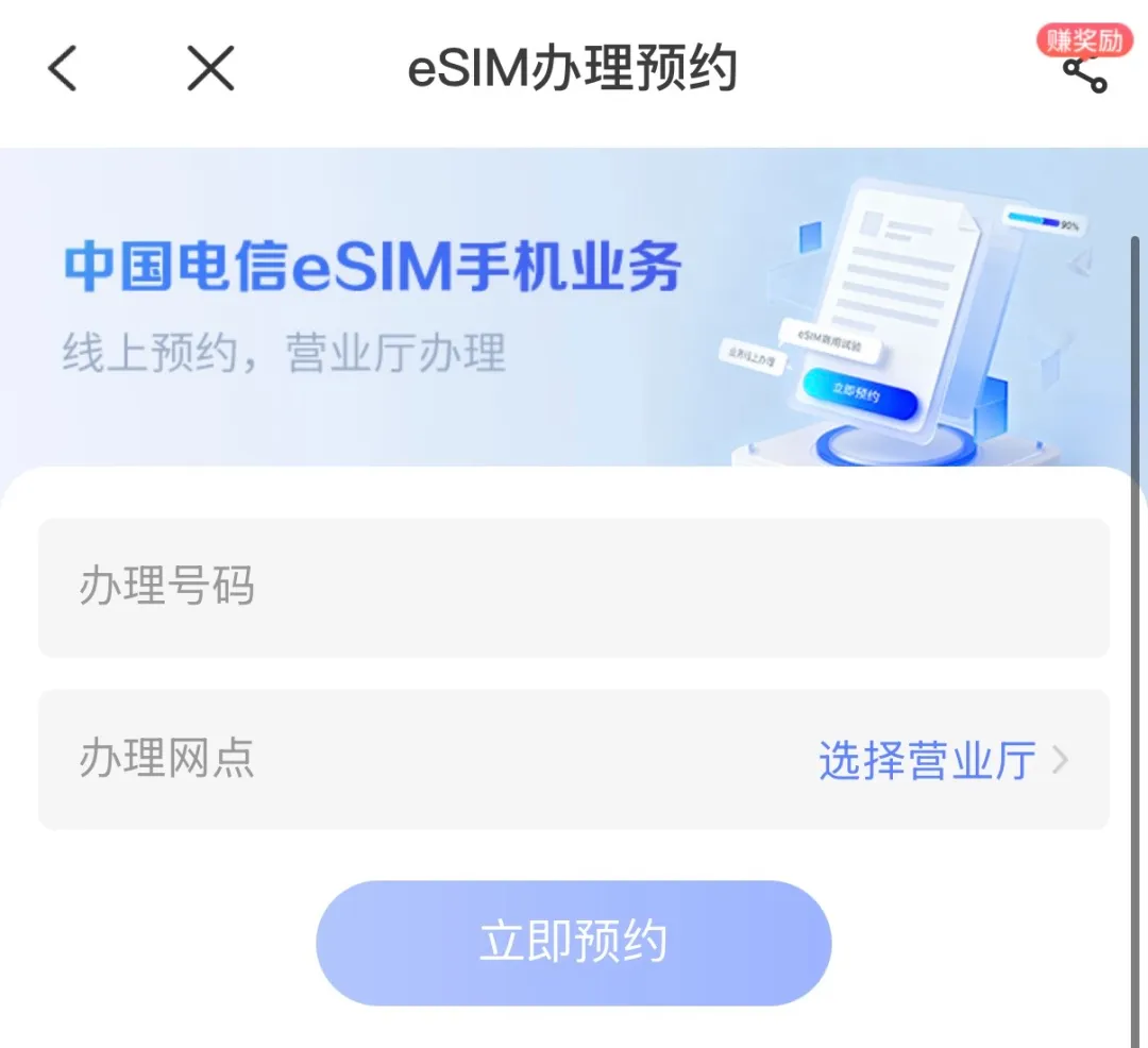 在中国电信 App 首页点击手机 eSIM 选项就能进入电信 eSIM 手机业务办理预约页面。