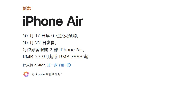 最新苹果官网更新了售卖信息,iPhone Air国行版即将在北京时间10月17日9点开启预购,22日正式开售。其具体定价: