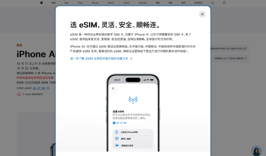而苹果官网也同步上线了发售信息,明确写着:“iPhone Air仅可通过eSIM激活运营商网络”,这意味着它将成为首款不支持实体SIM卡的国行iPhone。