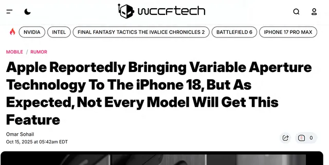 根据苹果一贯的 Pro 机型升级规律,在 iPhone 17 Pro 系列升级了长焦镜头后,iPhone 18 Pro 系列预计将重点升级主镜头和超广角镜头 1 。虽然目前关于超广角镜头的具体升级信息尚不明确,但主镜头引入可变光圈无疑将成为 iPhone 18 Pro 系列的一大亮点,预计这一功能将仅限于高端 Pro 机型 。