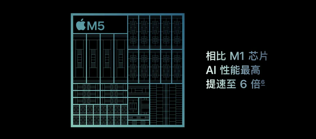 AI 可以说是 M5 芯片性能提升的一大亮点,M5 芯片搭载 16 核神经网络引擎(可以提高机器学习任务的速度),AI 推理的速度大幅提升,结合 CPU 和 GPU 的加速器,整体 AI 性能相较于上一代 M4 提升了 3.5 倍,支持设备端运行大型语言模型和复杂的 AI 应用。