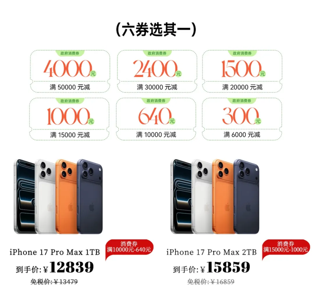 比如官网售价 17999 元的 iPhone 17 Pro Max 2TB 版本免税价 16859 元,叠加消费券后为 15859 元,比官网原价少了 2140 元。