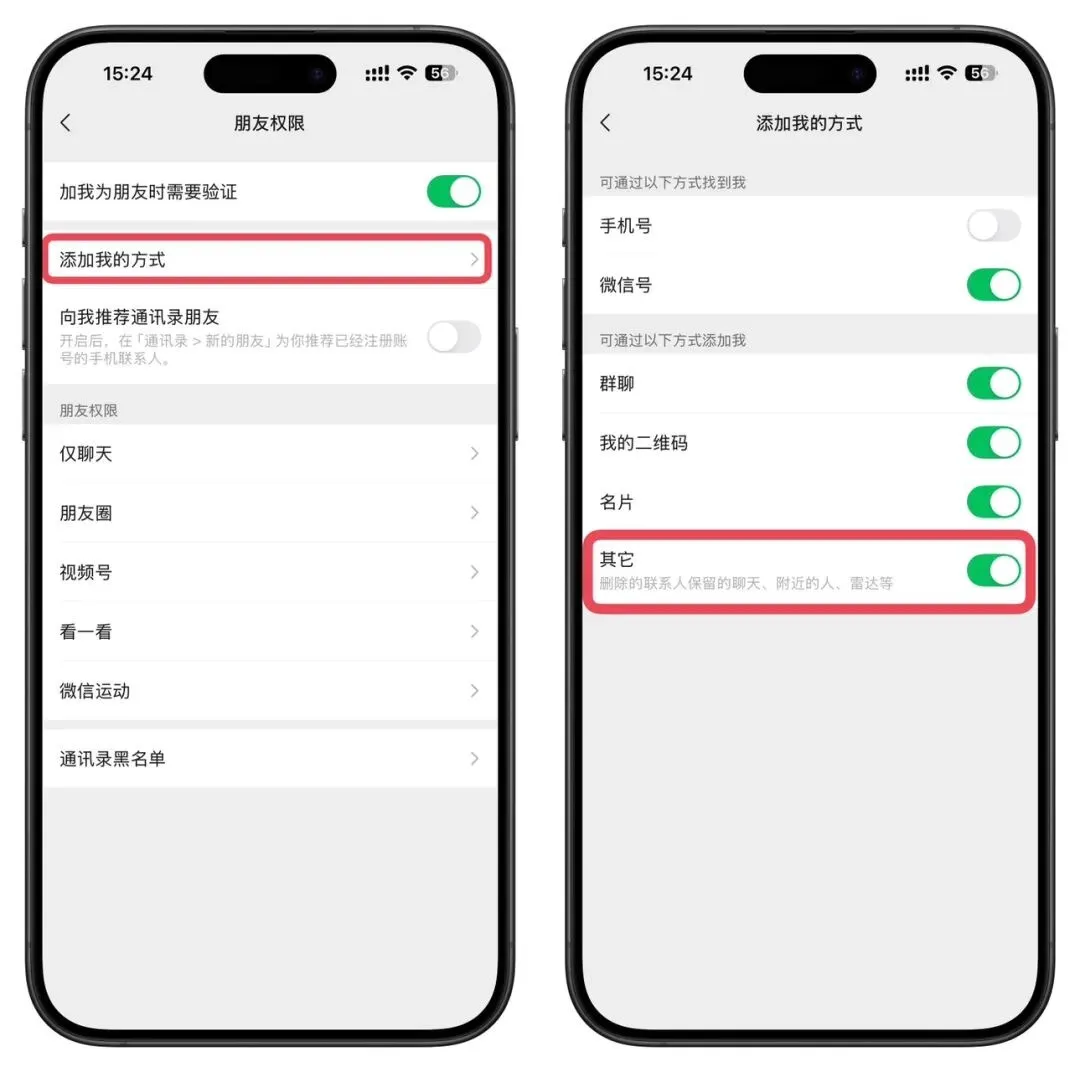 正文 iOS 微信终于正式上线新功能,添加好友这项需关闭! 手机通 V作者 /2025-12-22 16:16:31/4阅读 1222 iOS 微信 8.0.66 版本,发布了十几天是时间,这次又偷偷新增了不少新功能变化,实际这个功能,就是前段时间 iOS 微信内测了添加我的好友方式中新增了「其他」开关,今天,iOS 微信内测的功能终于上线。在微信“我-设置-朋友权限-添加我的方式”中,新增了可通过“其他”方式添加我为好友,关闭这个选项后,被你删除的好友将无法再通过聊天记录、附近的人、雷达等方式重新加回你,可避免被反复骚扰。大家快去看看自己有没有该功能,你觉得这个功能实用吗?