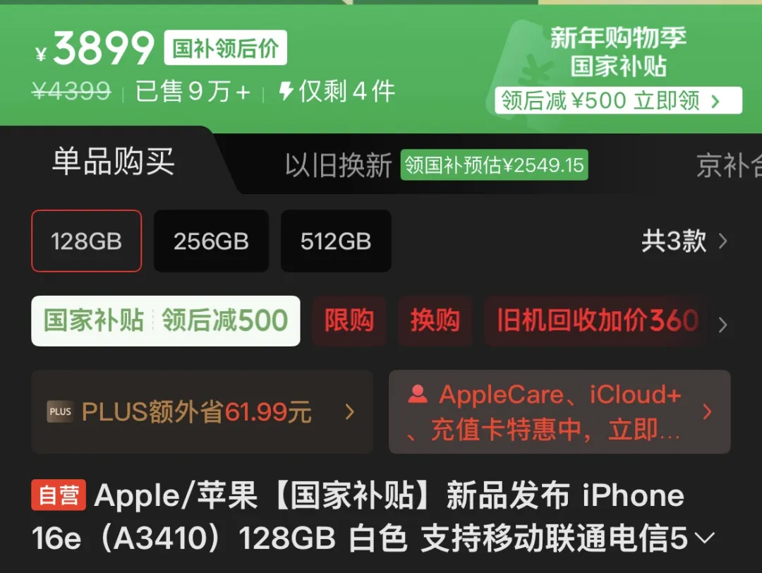 如上图所示,以京东自营售价为参考,目前这款手机国补之后的起售价仍然要3899元,而这个国补资质大部分的用户可能根本抢不到,对于想买这款手机的用户来说,可能还是会以4399元的售价入手,相比发布之初几乎没降价。