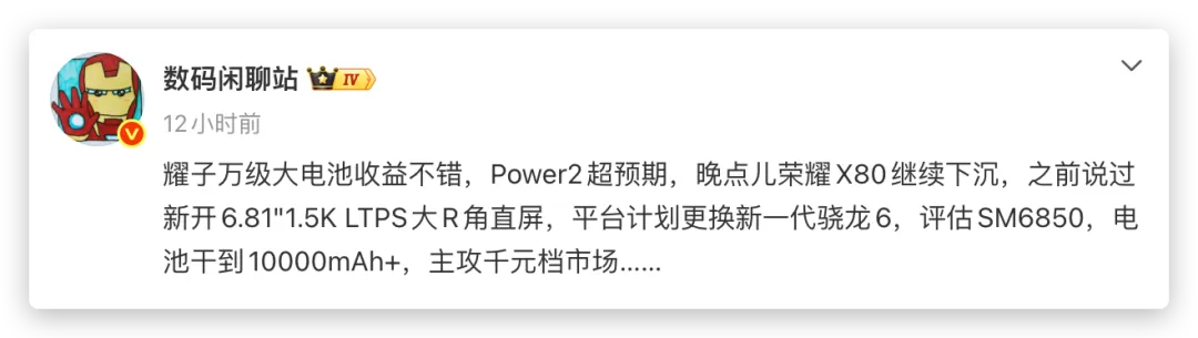 2月4日,数码闲聊站放出一波爆料,不仅简单透露了一下万级大电池Power2收益超预期的情况,更是专门划重点:定位更亲民、更下沉的荣耀X80,将会把电池容量卷到一个新的维度。