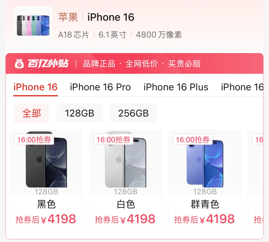 iPhone 16(8+128GB)目前跌破 4200 元,相比官方原价直降超 1800 元;